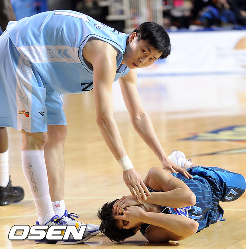9일 오후 전주실내체육관서 열린 '2011-2012 KB국민카드 프로농구' 6강 플레이오프 2차전 전주 KCC와 울산 모비스의 경기 1쿼터 KCC 신명호가 쓰러져 고통스러워하고 있다. 모비스 김동우가 상태를 살피고 있다