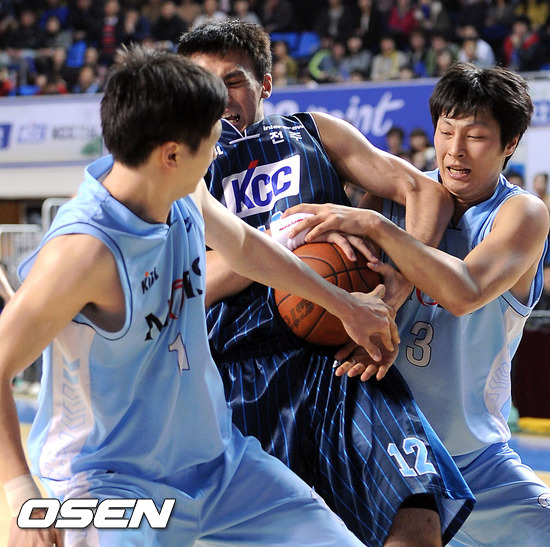 9일 오후 전주실내체육관서 열린 '2011-2012 KB국민카드 프로농구' 6강 플레이오프 2차전 전주 KCC와 울산 모비스의 경기 3쿼터 KCC 김태홍과 모비스 송창용이 리바운드를 다투고 있다
