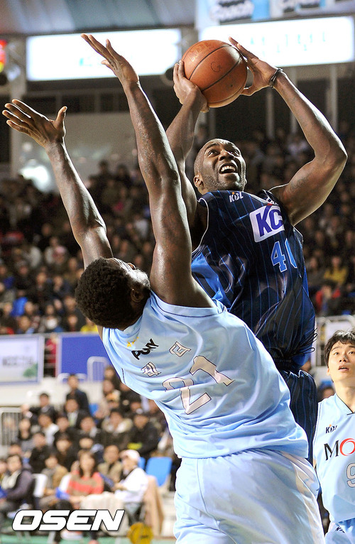 9일 오후 전주실내체육관서 열린 '2011-2012 KB국민카드 프로농구' 6강 플레이오프 2차전 전주 KCC와 울산 모비스의 경기 4쿼터 KCC 왓킨스가 골밑슛을 성공하고 있다