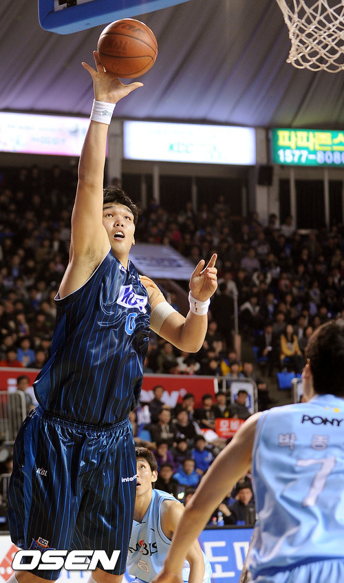 9일 오후 전주실내체육관서 열린 '2011-2012 KB국민카드 프로농구' 6강 플레이오프 2차전 전주 KCC와 울산 모비스의 경기 4쿼터 KCC 하승진이 골밑슛을 성공하고 있다