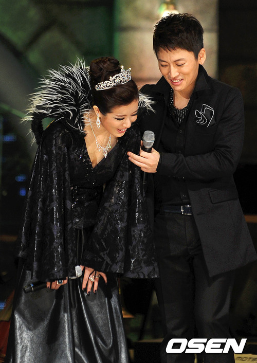 9일 오후 서울 서초동 한전아트센터에서 열린 tvN '오페라스타 2012' 세미 파이널에서 가수 박지헌이 결승 진출을 확정지은 가수 박기영을 축하하고 있다.