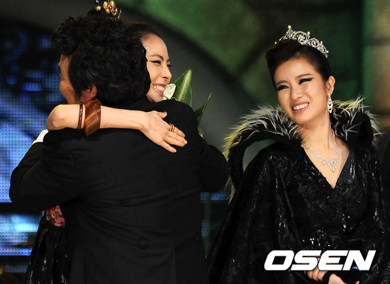 9일 오후 서울 서초동 한전아트센터에서 열린 tvN '오페라스타 2012' 세미 파이널에서 결승 진출에 실패한 가수 박지윤이 멘토 조용갑 테너와 포옹을 하고 있다.