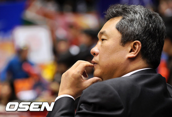 10일 오후 부산 사직실내체육관서 열린 '2011-2012 KB국민카드 프로농구' 6강 플레이오프 2차전 부산 KT와 인천 전자랜드의 경기 전 KT 전창진 감독이 걱정스러운 표정으로 코트를 바라보고 있다.