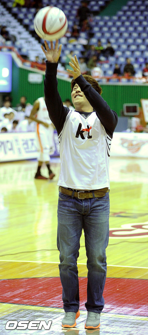 10일 오후 부산 사직실내체육관서 열린 '2011-2012 KB국민카드 프로농구' 6강 플레이오프 2차전 부산 KT와 인천 전자랜드의 경기 전 롯데 강민호가 시투를 하고 있다.