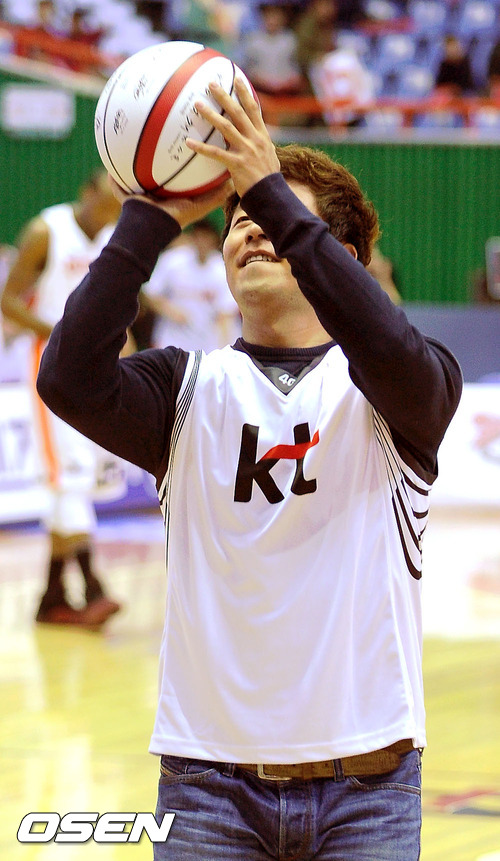 10일 오후 부산 사직실내체육관서 열린 '2011-2012 KB국민카드 프로농구' 6강 플레이오프 2차전 부산 KT와 인천 전자랜드의 경기 전 롯데 강민호가 시투를 하고 있다.