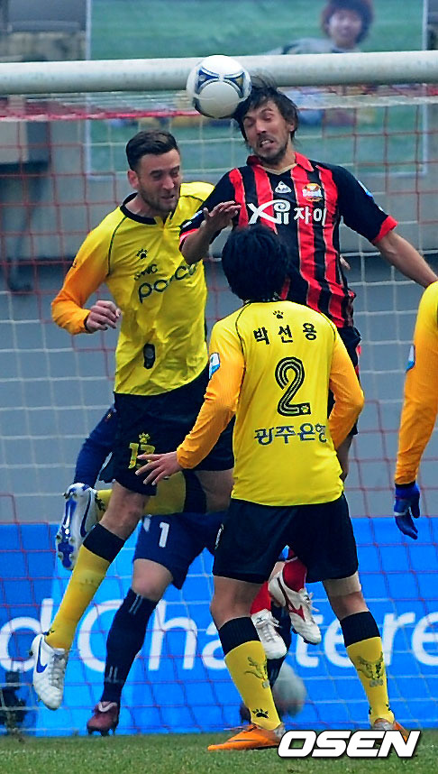 [OSEN=서울월드컵경기장, 곽영래 인턴기자] 10일 오후 서울월드컵경기장에서 열린 '현대오일뱅크 K리그 2012' 2라운드 FC 서울과 전남 드래곤즈의 서울 홈 개막전 경기에서 전반 데얀이 백헤딩으로 선제골을 넣고 있다.