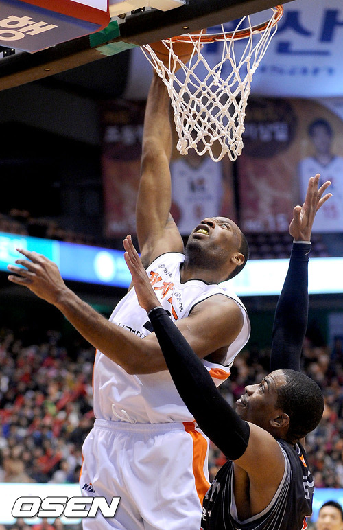 10일 오후 부산 사직실내체육관서 열린 '2011-2012 KB국민카드 프로농구' 6강 플레이오프 2차전 부산 KT와 인천 전자랜드의 경기 1쿼터 전자랜드 허버트힐이 골밑슛을 성공하고 있다