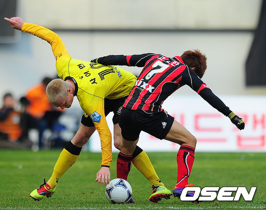 10일 오후 서울월드컵경기장에서 열린 '현대오일뱅크 K리그 2012' 2라운드 FC 서울과 전남 드래곤즈의 서울 홈 개막전 경기에서 전반 서울 고요한과 전남 사이먼이 볼다툼을 하고 있다.