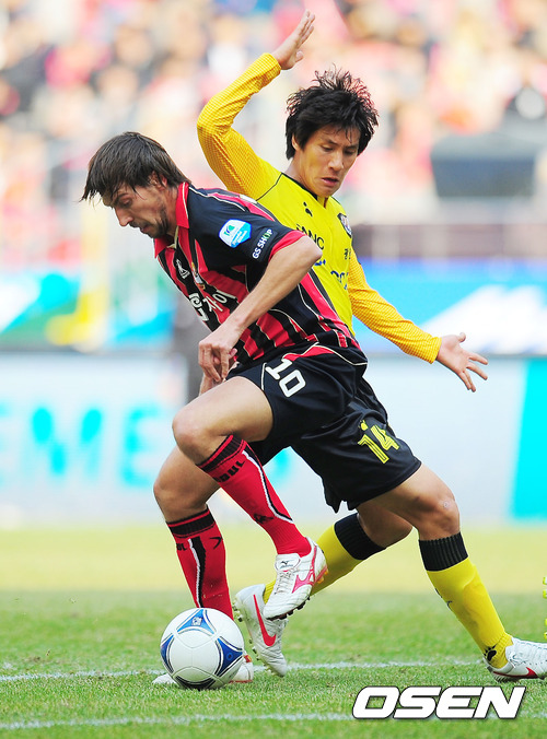 10일 오후 서울월드컵경기장에서 열린 '현대오일뱅크 K리그 2012' 2라운드 FC 서울과 전남 드래곤즈의 서울 홈 개막전 경기에서 전반 서울 데얀이 슛을 시도할때 전남 김근철을 돌파하고 있다.