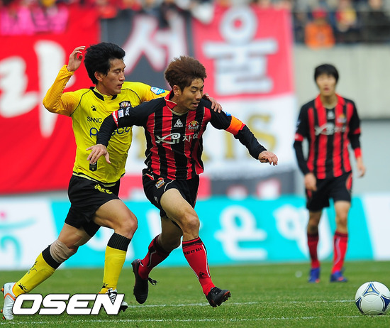 10일 오후 서울월드컵경기장에서 열린 '현대오일뱅크 K리그 2012' 2라운드 FC 서울과 전남 드래곤즈의 서울 홈 개막전 경기에서 전반 서울 하대성이 쇄도할때 이승희가 하대성을 잡고 있다.