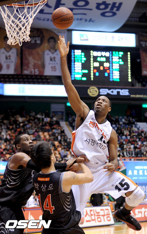 10일 오후 부산 사직실내체육관서 열린 '2011-2012 KB국민카드 프로농구' 6강 플레이오프 2차전 부산 KT와 인천 전자랜드의 경기 2쿼터 전자랜드 허버트힐이 골밑슛을 시도하고 있다