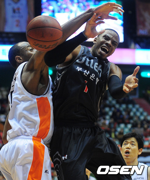 [OSEN=부산, 정송이 인턴기자] 10일 오후 부산 사직실내체육관서 열린 '2011-2012 KB국민카드 프로농구' 6강 플레이오프 2차전 부산 KT와 인천 전자랜드의 경기 1쿼터 KT 로드와 전자랜드 허버트 힐이 치열한 공 다툼을 하고 있다.