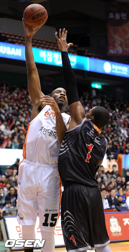 10일 오후 부산 사직실내체육관서 열린 '2011-2012 KB국민카드 프로농구' 6강 플레이오프 2차전 부산 KT와 인천 전자랜드의 경기 2쿼터 전자랜드 허버트힐이 훅슛 시도하고 있다