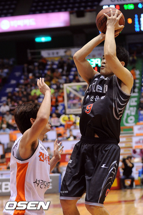 10일 오후 부산 사직실내체육관서 열린 '2011-2012 KB국민카드 프로농구' 6강 플레이오프 2차전 부산 KT와 인천 전자랜드의 경기 3쿼터 KT 조동현이 미들슛 시도하고 있다