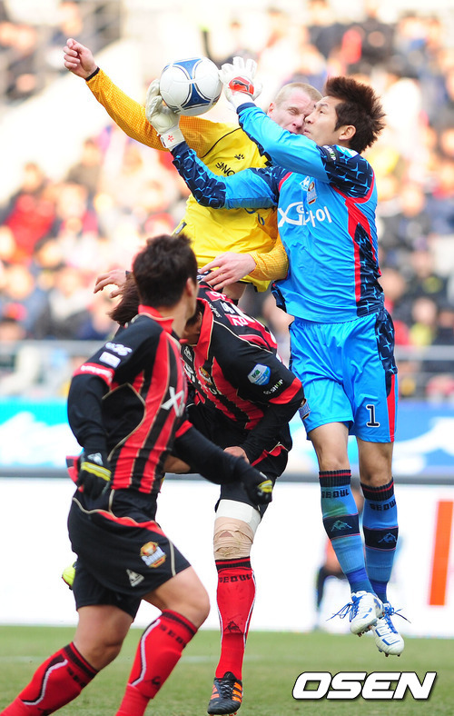 [OSEN=서울월드컵경기장, 곽영래 인턴기자] 10일 오후 서울월드컵경기장에서 열린 '현대오일뱅크 K리그 2012' 2라운드 FC 서울과 전남 드래곤즈의 서울 홈 개막전 경기에서 후반 전남 사이먼과 서울 김용대가 공중볼 싸움을 하고 있다.
