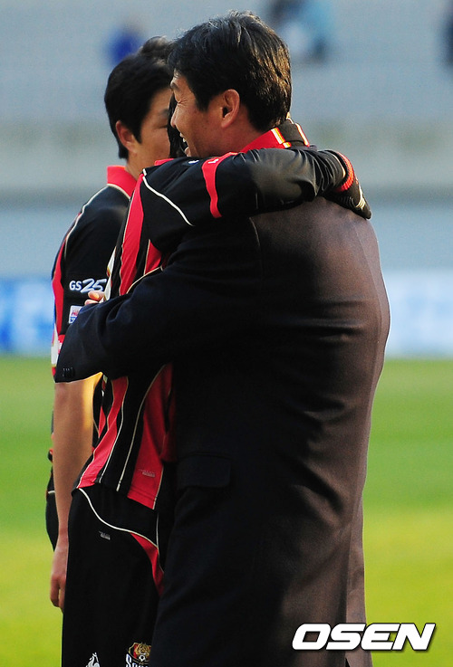 경기를 마치고 최용수 감독이 몰리나와 뜨거운 포옹을 나누고 있다. / rumi@osen.co.kr