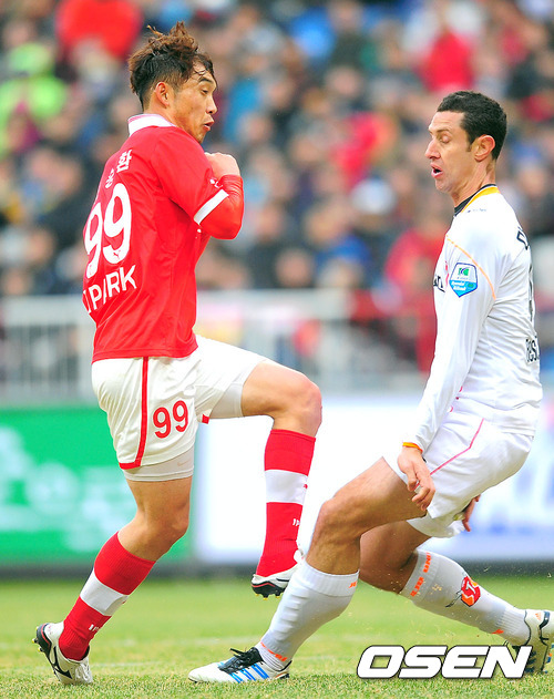 10일 오후 부산 아시아드경기장에서 열린 '현대오일뱅크 K리그 2012' 부산 아이파크와 제주 유나이티드의 경기 전반 부산 방승환이 선취골을 넣고 있다