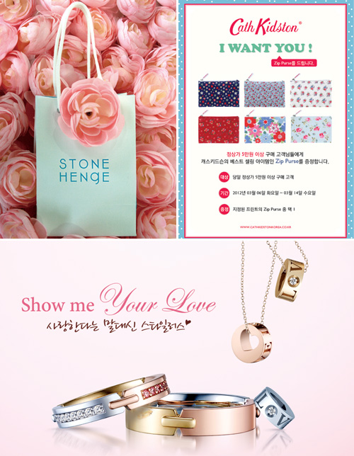 액세서리 브랜드 ‘스톤헨지’에서는 제품을 구매한 이에 한해 ‘핑크 코사지’를 증정한다. 패션잡화 브랜드 ‘캐스키드슨’은 5만원 이상 구매자에게 ‘꽃 무늬 파우치’를 준다.