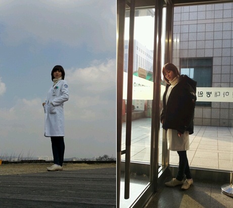 사진 속 푸른 하늘을 배경으로 한혜진은 의사 가운을 입고 있고, 또 다른 사진에는 피곤한 모습의 한혜진이 병원 문에 기대어 졸고 있다.
