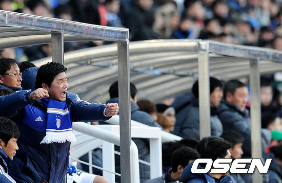 후반 수원 윤성효 감독이 2대0으로 앞서가는 가운데 선수들을 독려하고 있다.