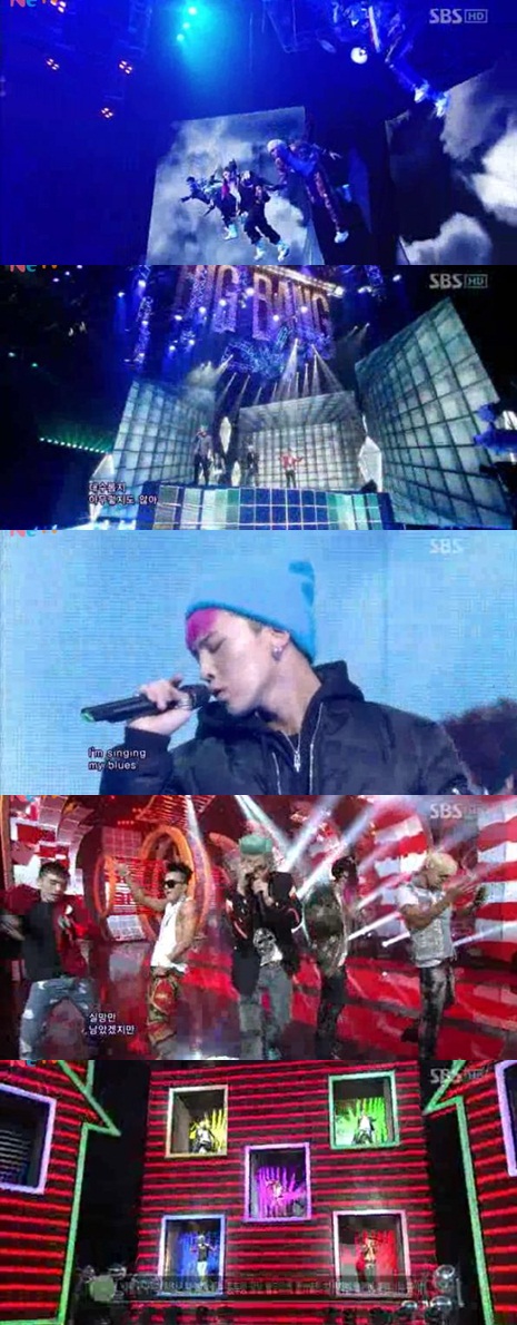 지난 11일 오후 방송된 SBS '인기가요'에는 5집 미니앨범으로 컴백한 빅뱅이 출연, 인트로부터 시작해 '블루', '배드보이', '판타스틱 베이비' 등 총 4가지의 다채로운 무대를 선사했다.