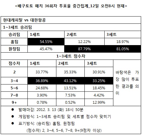 1~3세트 승리팀과 점수차를 맞히는 배구토토 매치 게임에서 세트별 예상 승리팀은 1세트(54.55%)는 현대캐피탈, 2세트(87.79%)와 3세트(81.05%)는 대한항공으로 나타났다. 3세트까지의 각 세트별 예상 점수차는 1세트(36.89%), 2세트(43.12%), 3세트(33.25%) 모두 3~4점차가 가장 높게 집계됐다.