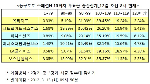 [농구토토] 국민체육진흥공단(www.kspo.or.kr)이 발행하는 체육진흥투표권 수탁사업자인 스포츠토토 공식 온라인 발매 사이트인 베트맨(www.betman.co.kr)은 오는 13일 펼쳐지는 유타재즈-디트로이트피스톤스(1경기), 피닉스선즈-미네소타팀버울브스(2경기), LA클리퍼스-보스턴셀틱스(3경기) 등 미국프로농구(NBA) 3경기를 대상으로 한 농구토토 스페셜N 15회차 투표율 중간집계 결과, 참가자들은 3경기 LA클리퍼스-보스턴셀틱스전에서 양 팀간 접전을 내다봤다고 전했다.
