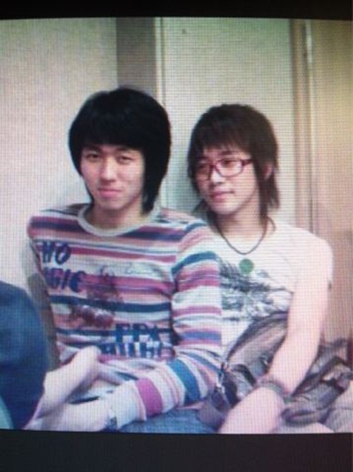 사진 속 슬옹(왼쪽)은 덥수룩한 장발 스타일을, 준호(오른쪽)는 샤기컷 스타일에 뿔테 안경을 쓰고 있어 지금과는 사뭇 다른 이미지다.