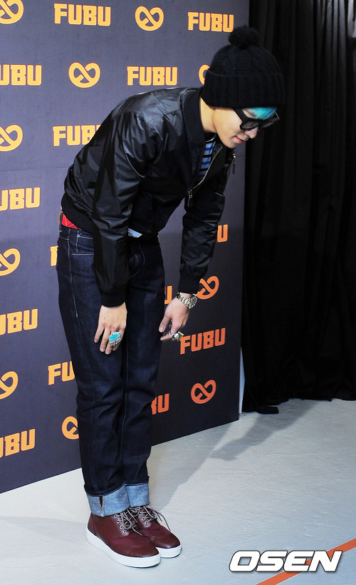 12일 오후 서울 중구 명동 후부 명동 스토어에서 열린 포스트 힙합 감성 스트리트 캐주얼 후부(FUBU)의 ‘2TOP Jeans’ 트라이얼 캠페인에 참석한 뮤지션 탑이 포토월에서 인사를 하고 있다.