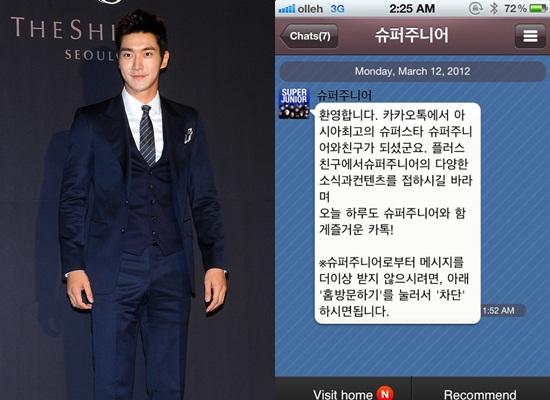 사진 속에는 최시원이 메신저 어플 속 '플러스 친구'로 등록된 슈퍼주니어와 친구를 맺은 뒤, 들어온 메시지가 담겨있다.