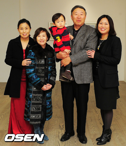 플루트 독주회가 끝난 후 김혜성씨의 개인전 장소에서 김응룡 전 삼성 라이온즈 사장과 배우자 최은원 씨, 차녀 김인성(왼쪽)씨, 장녀 김혜성(오른쪽)씨와 포즈를 취하고 있다. / rumi@osen.co.kr