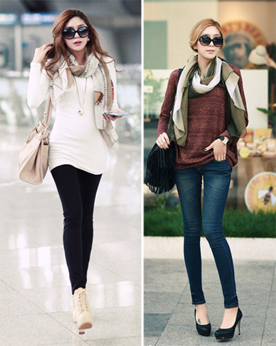 스카프가 가진 페미닌하고 성숙한 느낌 때문에 니트나 청바지 같은 캐주얼 룩에는 어울리지 않을 것 같지만 오히려 세련된 연출을 도와준다. 캐주얼 룩에는 자연스럽게 두어 번 휘감는 스타일이 편안하면서도 발랄한 분위기를 주기 때문에 좋다.