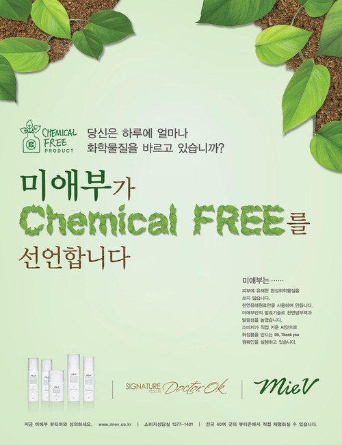 합성화학물질을 포함하지 않고, 완전히 천연유래원료만을 사용하여 만든 '무합성’ 화장품을 표방하는 미애부는 전 제품에 Chemical free 로고를 새긴 데 이어, 다 쓴 용기로 화분을 재활용해 만들고 화장품의 원료가 되는 씨앗과 함께 공짜로 제공하는 ‘OK, Thank you 캠페인’도 시작했다.