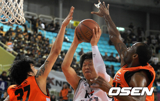 14일 오후 인천 삼산월드체육관에서 열린 '2011-2012 KB국민카드 프로농구' 인천 전자랜드와 부산 KT의 플레이오프(PO) 4차전, 1쿼터 KT 박상오가 전자랜드 주태수와 허버트힐의 블록슛을 피해 슛을 시도하고 있다.