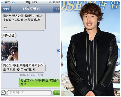 이광수는 15일 오전 자신의 트위터에 “오늘 특히 많이 오는 동훈이 형의 따뜻한 문자”라는 글과 함께 사진을 게재했다.