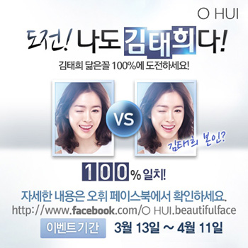 오휘(LG생활건강)는 브랜드 모델로 활약하고 있는 톱스타 김태희와 얼마나 닮았는지 분석해보는 신개념 페이스북 이벤트 ‘도전! 나도 김태희다!’를 다음달 11일까지 진행한다.
