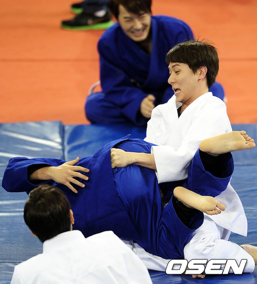 15일 오후 서울 잠실 학생체육관에서 열린 JTBC '신화방송' 현장공개 및 제작발표회에서 신화 앤디와 이민우가 유도 경기를 하고 있다.