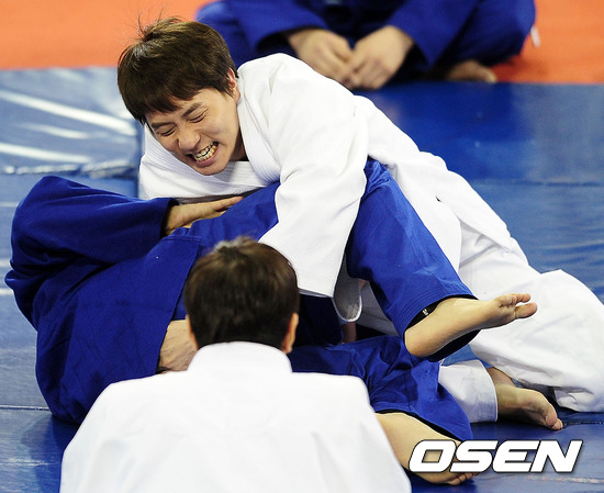 15일 오후 서울 잠실 학생체육관에서 열린 JTBC '신화방송' 현장공개 및 제작발표회에서 신화 앤디와 이민우가 유도 경기를 하고 있다.