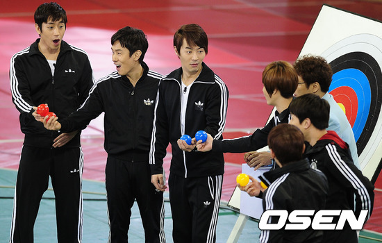 15일 오후 서울 잠실 학생체육관에서 열린 JTBC '신화방송' 현장공개 및 제작발표회에서 신화가 양궁 종목을 겨루기에 앞서 팀을 나누고 있다.