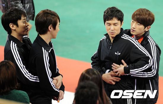 15일 오후 서울 잠실 학생체육관에서 열린 JTBC '신화방송' 현장공개 및 제작발표회에서 신화가 장난을 치고 있다.