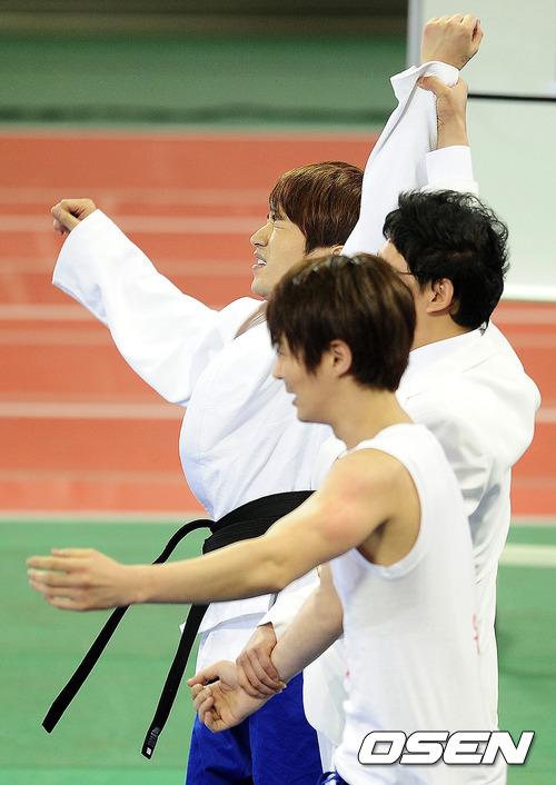 15일 오후 서울 잠실 학생체육관에서 열린 JTBC '신화방송' 현장공개 및 제작발표회에서 신화 이민우가 유도 경기에서 우승을 차지하고 기뻐하고 있다.