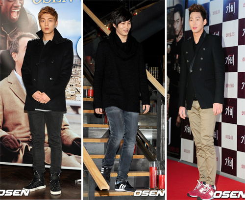 남자스타들에게서 가장 흔히 보이는 코디 공통점은 포멀한 상의와 캐주얼한 하의의 매치다. 상의에는 심플한 셔츠나 티셔츠에 재킷 또는 코트를 매치하고, 하의는 청바지를 입어 포멀한 캐주얼 룩을 완성하는 것. 이때 포인트는 이너나 아우터와 비슷한 컬러의 운동화를 신어 한결 편하고 영(young)한 느낌을 연출한다는 점이다.