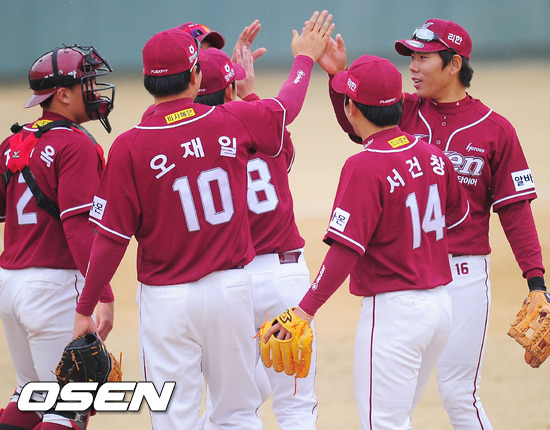 16일 오후 충청북도 청주구장에서 열린 한화 이글스와 넥센 히어로즈의 연습경기에서 넥센은 9회 대타 오재일의 깜짝 역전포로 시범경기 전 마지막 연습경기에서 웃었다.