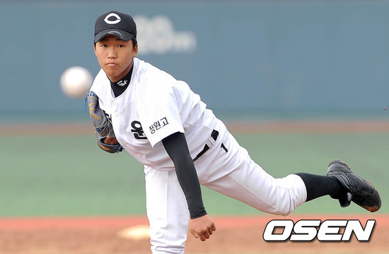 17일 오전 서울 구의동 구의야구장에서 열린 '고교야구 주말리그' 개막전 서울고와 청원고의 경기, 1회초 무사 청원고 선발투수 김대훈이 역투를 하고 있다.