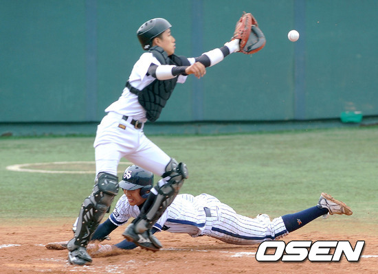 17일 오전 서울 구의동 구의야구장에서 열린 '고교야구 주말리그' 개막전 서울고와 청원고의 경기, 1회초 1사 만루 서울고 김민섭의 희생플라이때 홈으로 쇄도한 3루주자 김창권이 세이프 되고 있다.