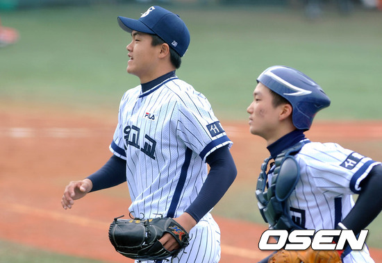 17일 오전 서울 구의동 구의야구장에서 열린 '고교야구 주말리그' 개막전 서울고와 청원고의 경기, 1말 2사에서 청원고 윤영우를 내야땅볼로 처리한 서울고 장현식이 미소를 지으며 덕아웃으로 가고 있다.