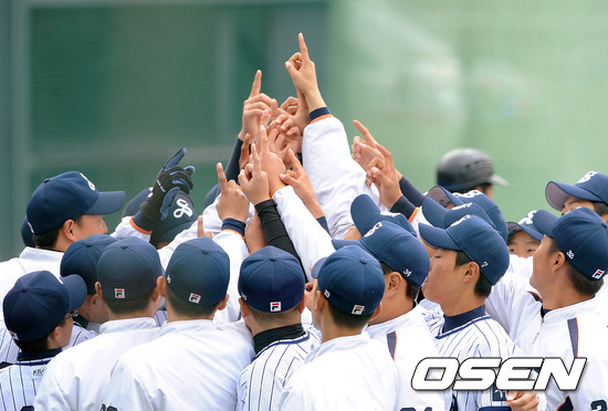 17일 오전 서울 구의동 구의야구장에서 열린 '고교야구 주말리그' 개막전 서울고와 청원고의 경기, 2회초 공격 전 서울고 선수들이 파이팅을 외치고 있다.