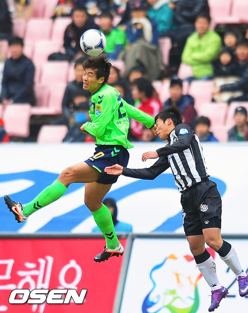 17일 오후 전주월드컵경기장에서 열린 전북 현대와 전남 드래곤즈의 '현대오일뱅크 K리그 2012' 3라운드서 전반 전북 이동국이 전남 이종호보다 먼저 공중 볼을 따내고 있다.