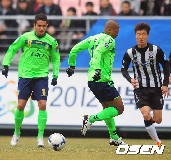 17일 오후 전주월드컵경기장에서 열린 전북 현대와 전남 드래곤즈의 '현대오일뱅크 K리그 2012' 3라운드서 전반 전북 이동국이 전남 루이스가 백패스를 하고 있다.