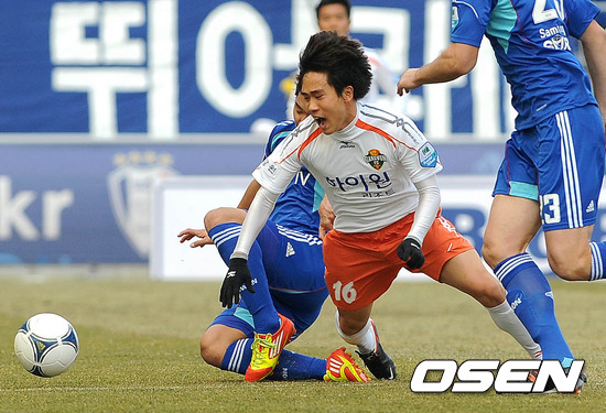 17일 오후 수원 월드컵경기장에서 열린 '현대오일뱅크 K리그 2012' 3라운드 수원 블루윙즈와 강원 FC의 경기, 전반 강원 김정주가 수원 신세계의 태클에 걸려 넘어지고 있다.